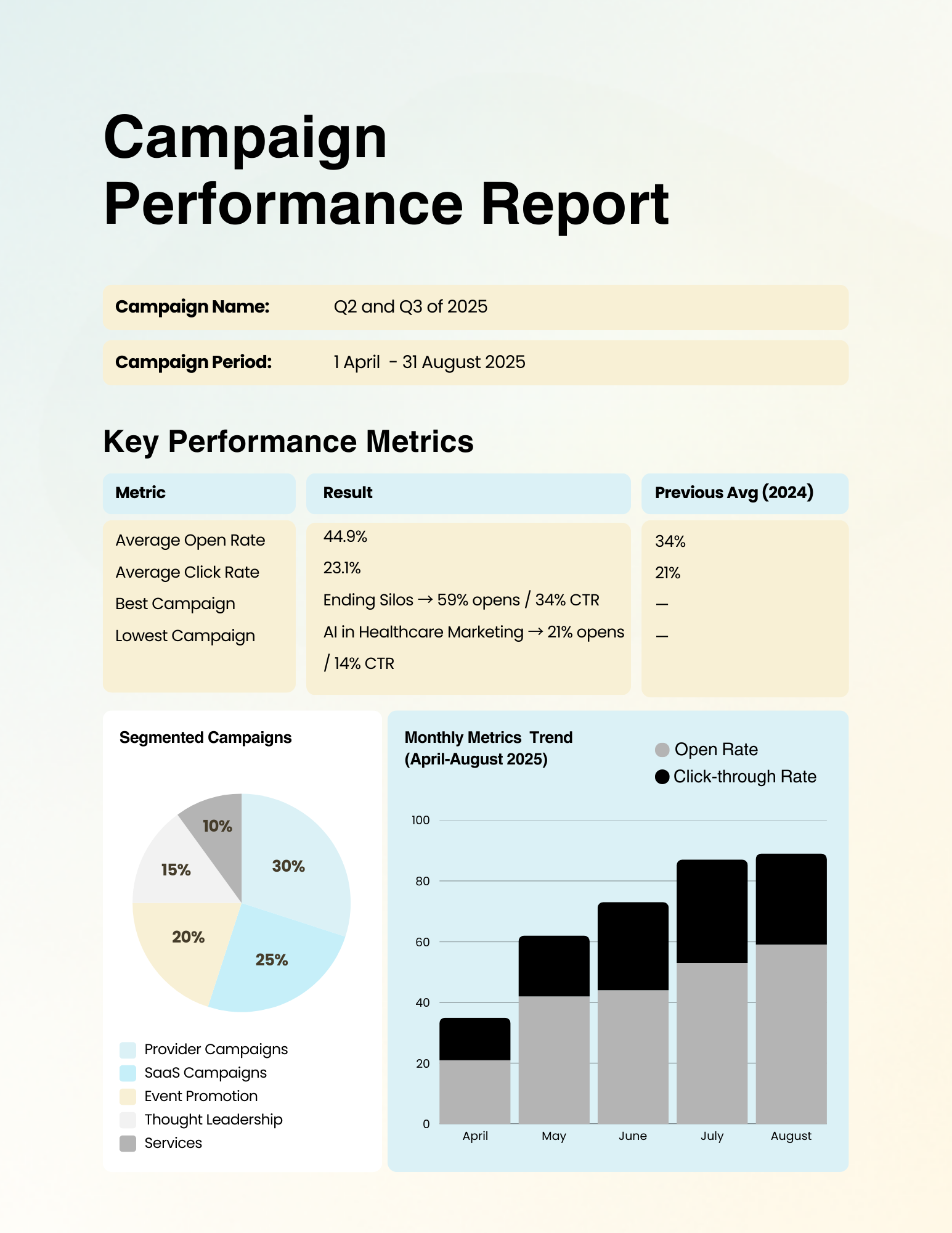 A snapshot of campaign reporting showing improvements in open rates, conversions, and engagement over time.