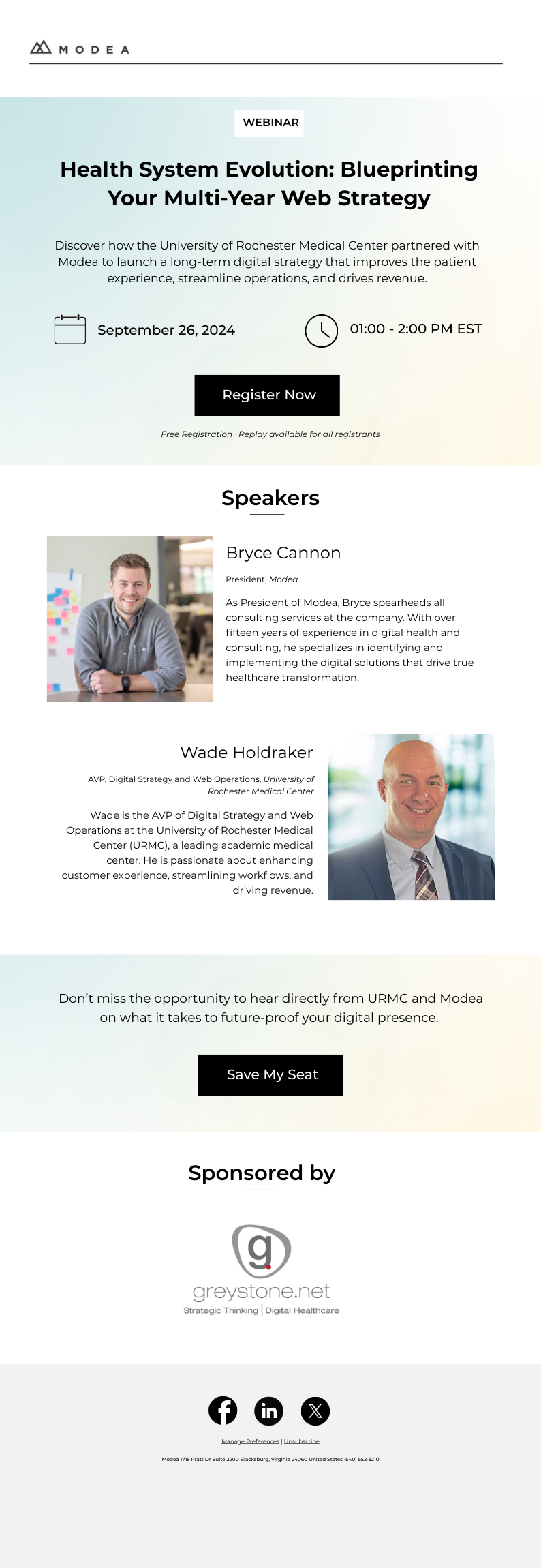 Part of a segmented drip campaign, this newsletter was designed to re-engage prospects, align with Sales outreach, and build trust. It promoted a webinar co-hosted with a client to showcase Modea’s expertise.